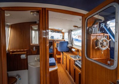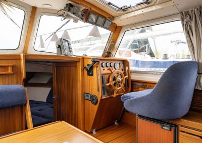 Frida varusteltiin rakennusvaiheessa keulapotkurilla ja avotilaan rakennettiin toinen ohjauspiste rantamanöövereitä varten. Ei tarvitse kipparin juoksennella sisäohjaamosta poijujen ja ankkureiden perään, vaan kaikki hoituu näppärästi takaohjaamosta. Poijun saa kiinni oikean käden ojennuksella. Keulapotkurin käyttökytkimet ovat avotilassa ja sisäohjaamossa.